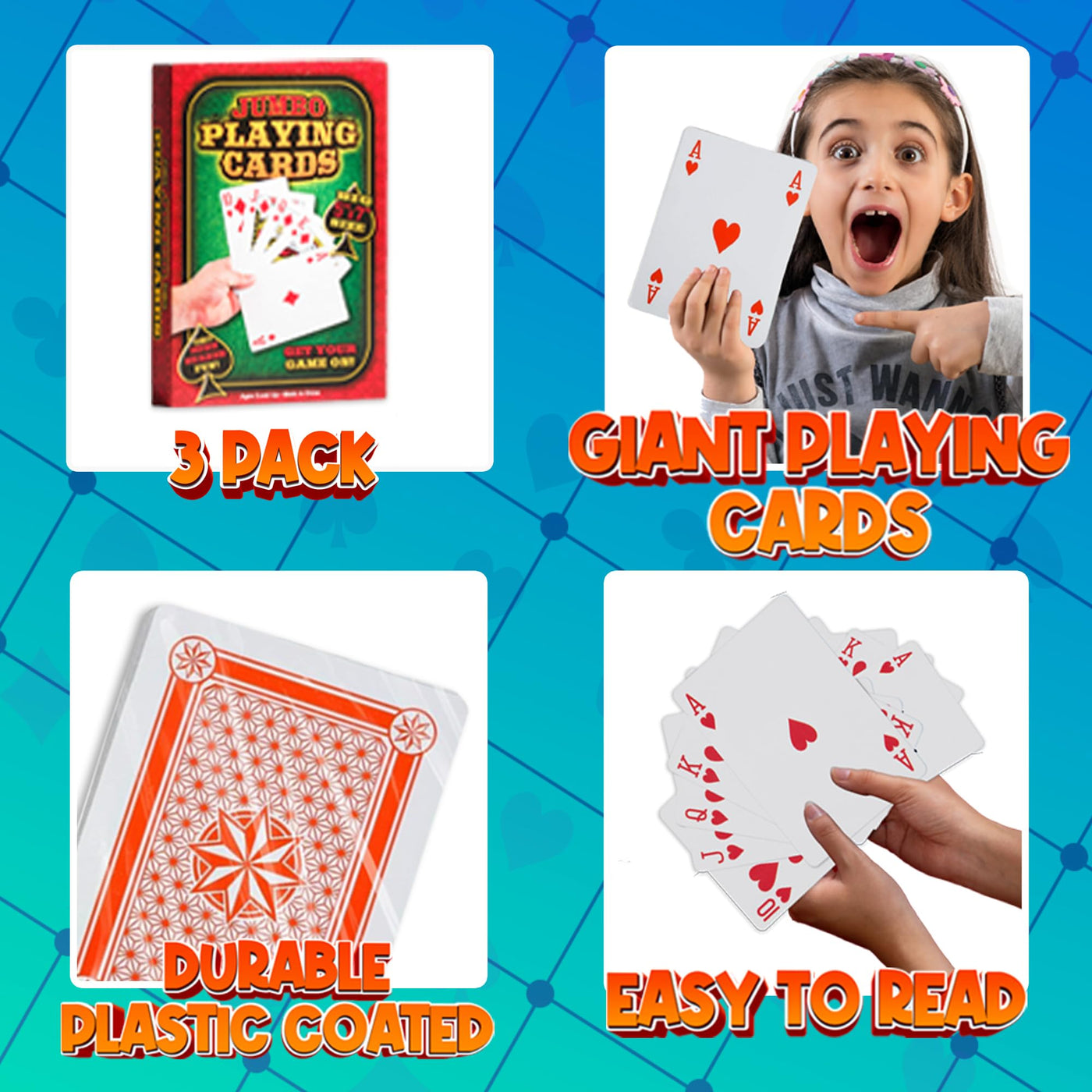 • PACK OF THREE GIANT FULL PLAYING DECKS: If you've been looking for a fun alternative to traditional playing cards, then your search is over! That's because our large playing cards are jumbo-sized and come in 3 decks per pack. That means you'll have 3 decks of giant cards at a fraction of the value.