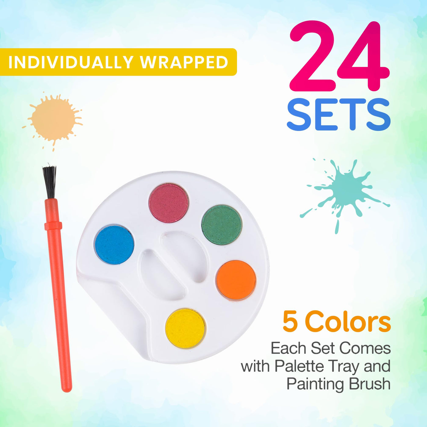 Each bulk pack of Bedwina watercolor kids paint kits includes a total of 24 individually wrapped mini paint sets. Every set features 5 watercolor paints, a palette tray, and a painting brush. The paint tray colors are orange, yellow, green, red, and blue. As you know with kids we can never have too many art supplies. That's why kids love receiving these small paint sets as prizes and party favors. That's because compared to others each of our paint sets has more paint and therefore lasts longer for extra fun. Simply use water, dip the brush and be ready to paint in no time!