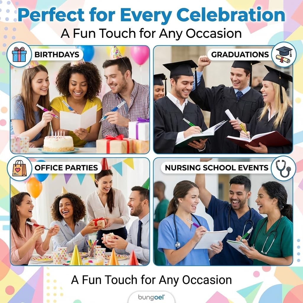 Our Bedwina bulk pack of syringe pens includes a total of 12 black and blue ink pens in assorted liquid filled neon colors. Colors include: blue, green, yellow, pink, orange and red. These cute syringe pens are a great novelty gift or accessory for kids, doctors, nurses, RN's/CNAs, healthcare professionals, nursing students and more