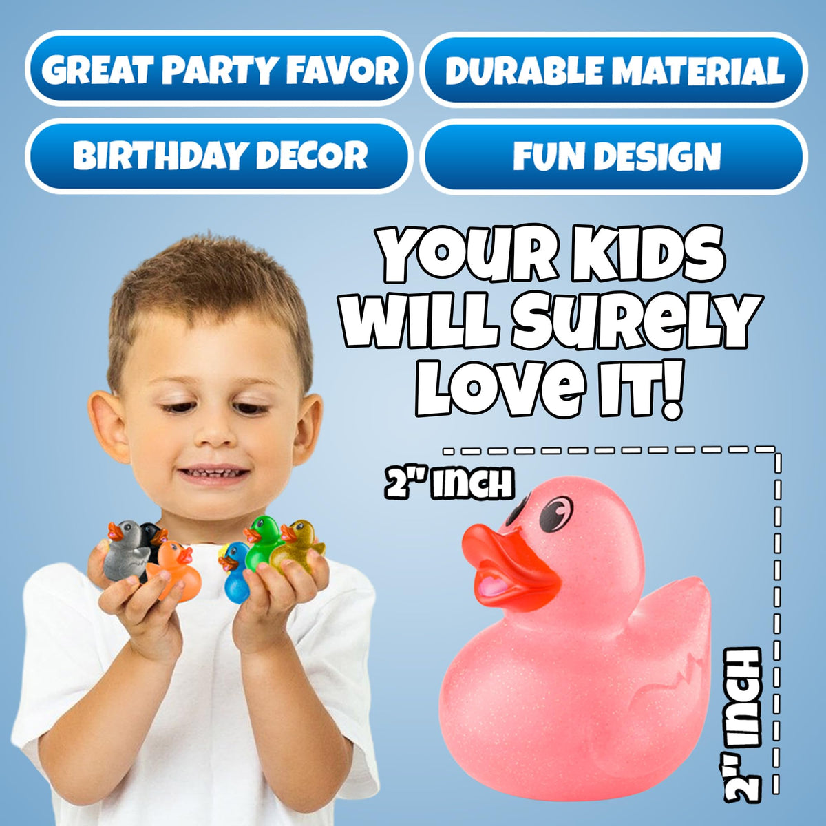PERFECT SIZE FOR PARTY FAVORS & PRIZES: Give your guests a unique and memorable gift by giving away these metallic glitter rubber ducks at your next party. Ideal for Birthday Party Decorations, Baby Showers, Carnival Game Prizes, Cupcake and Cake Toppers, and Party Favor Gifts so that your little ones can bring home and enjoy bath time with their new friends
