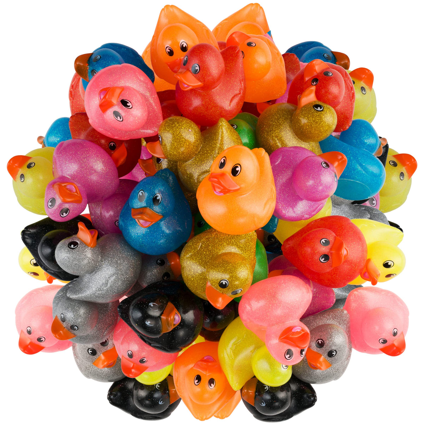PACK OF 50 GLITTER RUBBER DUCKS: This assortment of rubber ducks by Bedwina will be sure to add some shimmer and sparkle to your life. Each order includes a random variety of 50 adorable rubber ducks in 10 unique glittery colors. Rubber Duck Colors Include Yellow, Gold, Black, Brown, Blue, Green, Silver, Pink, Purple & Red