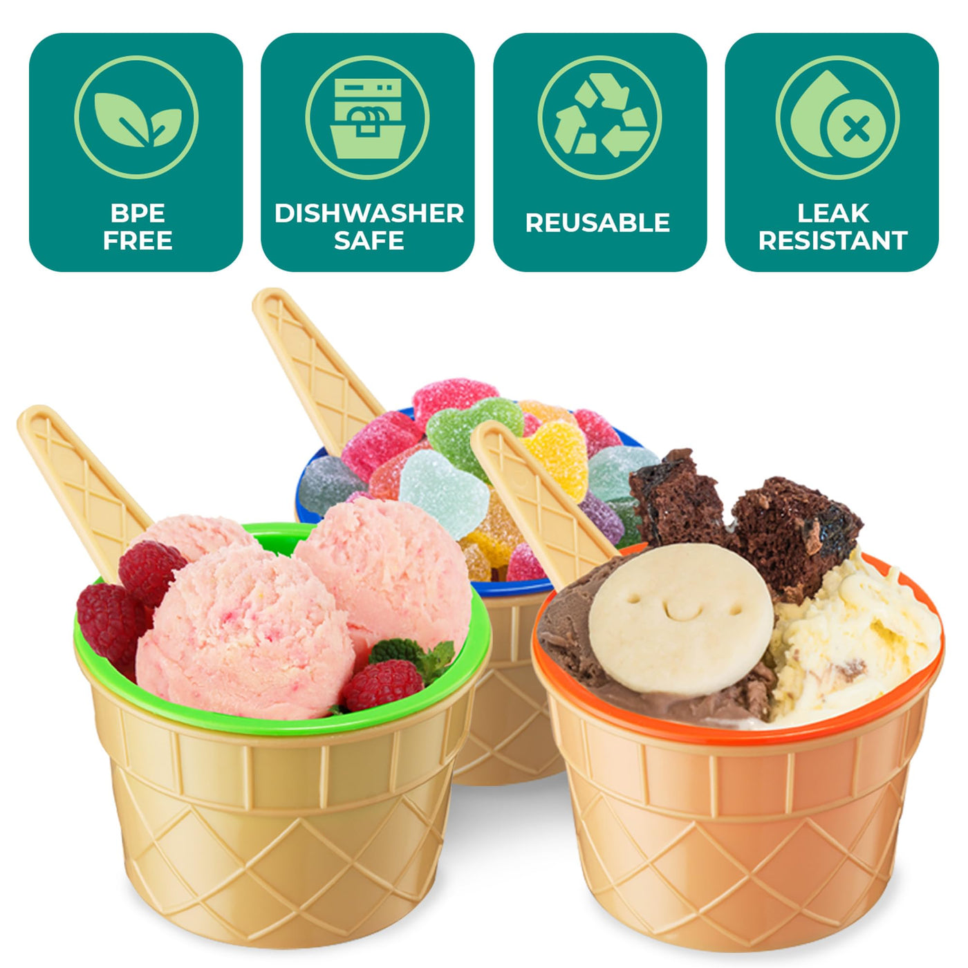 JoyServe Ice Cream Bowls and Spoons Set - Reusable Plastic Ice Cream Cups and Waffle Cone Shaped Spoons for Dessert Ice Cream Sundaes, Frozen Yogurt, Gelato, Birthday Party Decorations - 12-Pcs