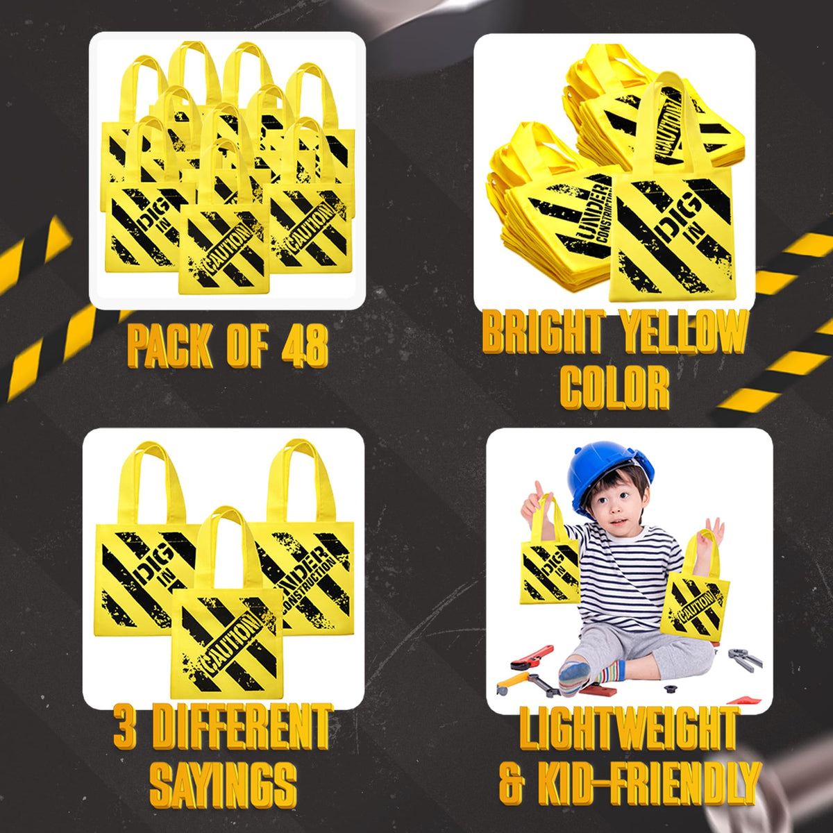 Are you wondering what to put your goodies in for your tot's next birthday party? Our themed party favor bags are sure to wow your little guests. Each pack of construction themed party favor bags includes 48 party favor goodie bags with 3 different sayings "under construction", "caution", & "dig in" perfect to fill with construction favors your little partygoers will love. Mini tote bags are made of nonwoven polyester material and measure 6 x 6 inches with a 4-1/2-inch handle making them easy for kids to carry and the ideal size to fill with toys, loot, goodies, treats, crayons, candy, and more. At an affordable value that’s sure to fit into even the tightest budget these mini party favor bags in bulk are sure to bring joy to your kids’ faces. They are made of polyester canvas, which means they are better than paper party favor bags because they can be reused over and over.